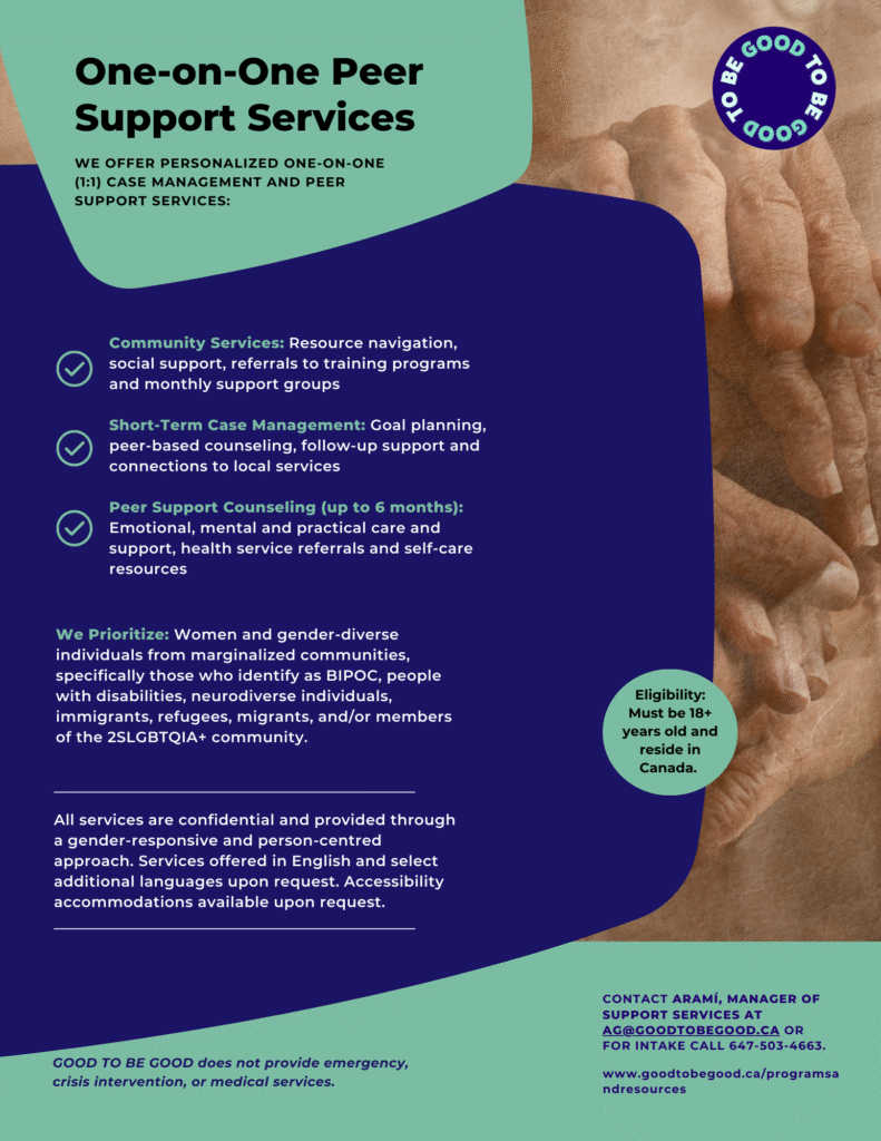 We offer free, confidential one-on-one (1:1) peer support for women and gender-diverse community members (18+) through phone or video appointments. Services are tailored to each person’s unique needs and goals, and available in English and select languages.